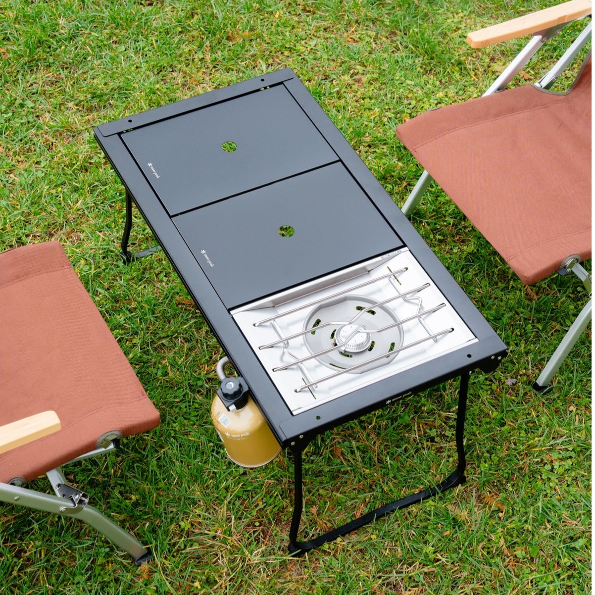 テーブルフレームの長辺外側はレール状になっており、別売りのガスカートリッジが取り付けられます。