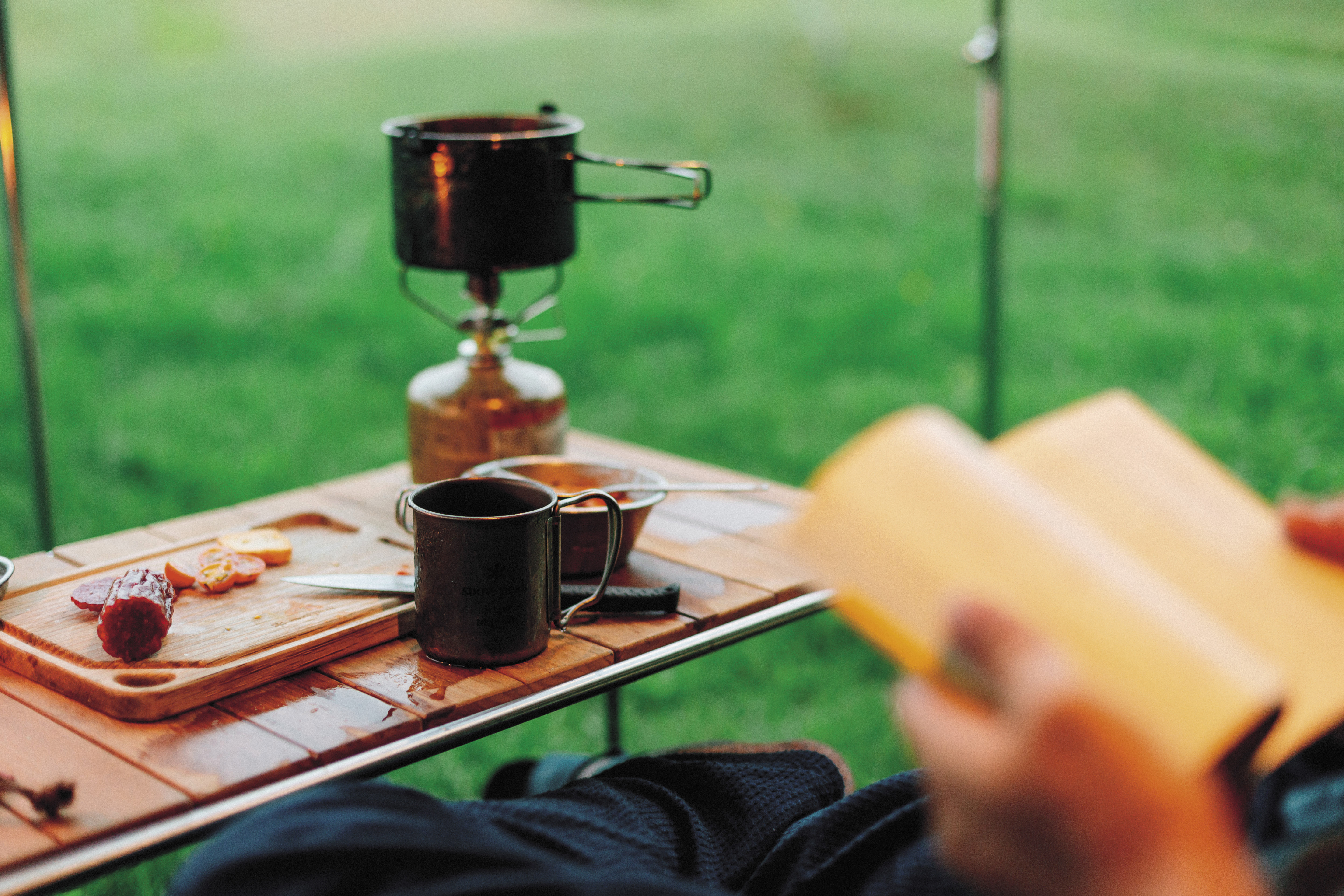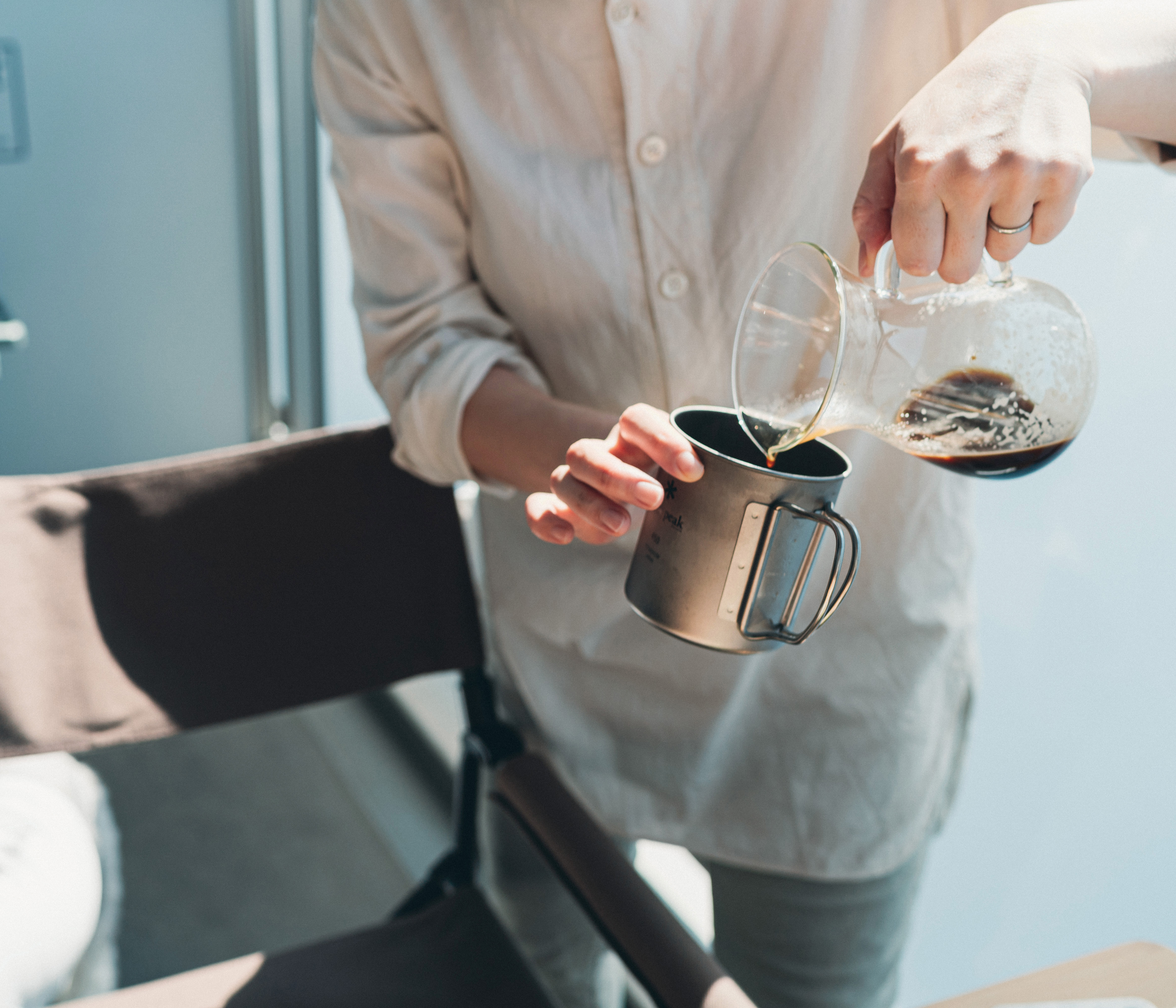 キャンプの朝、澄んだ空気の中で味わう一杯のコーヒー。