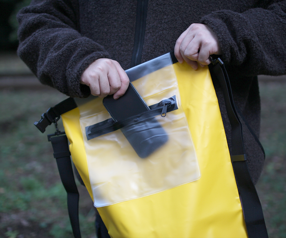 ロールトップ仕様の開口部は簡単に開閉でき、濡れた衣類や荷物の収納にも便利です。