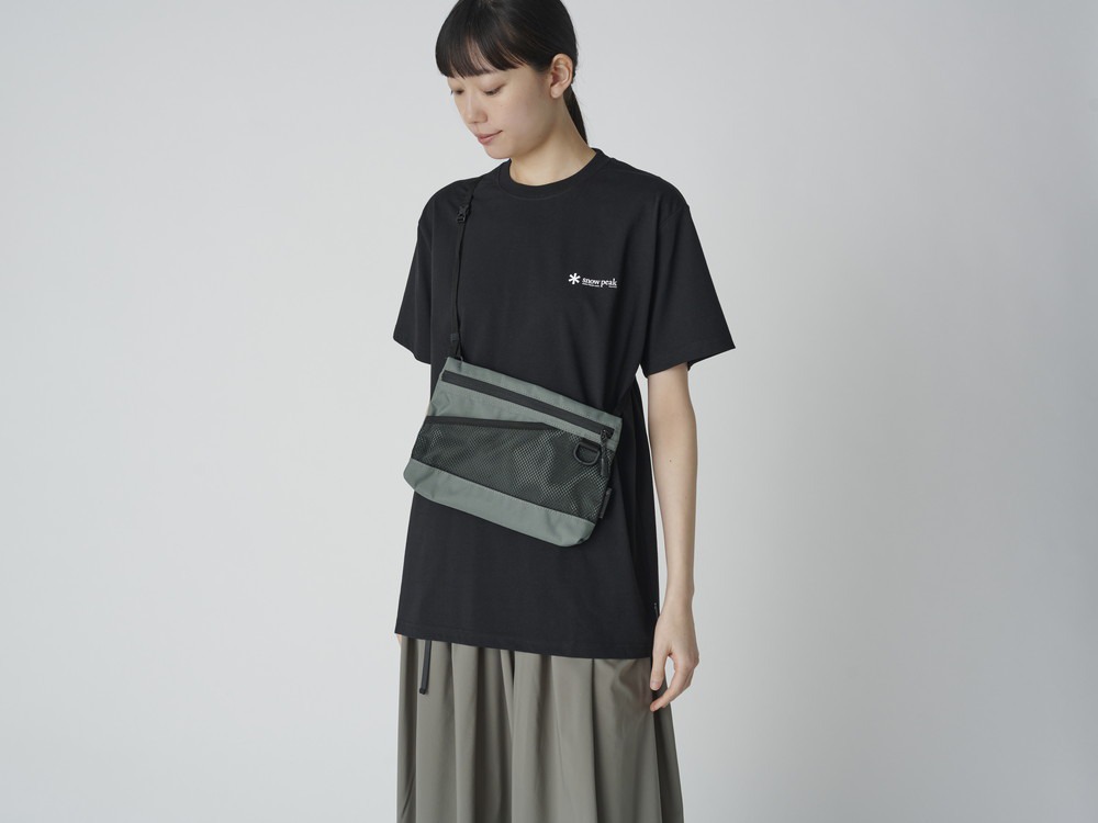 こちらは表地に合わせてファスナーもPFASフリーに変更したサコッシュ。最低限の機能を備えつつ、Snow Peakらしいギミックの効いた逸品です。手の入れやすいフロントメッシュポケットが、デザインアクセントの役割も担うディテールに。改良点としては、インナーポケットとDリングの仕様変更が挙げられ、加えてブランドピスネームのデザインも変更しています。