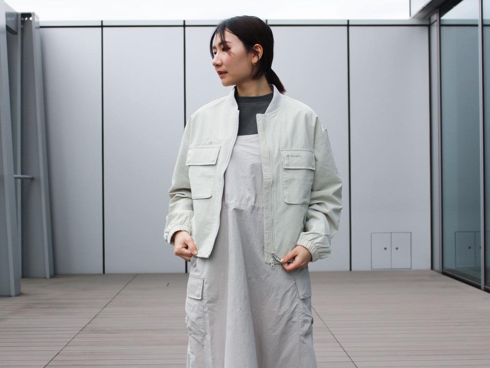 フロントのマルチポケットがポイント、ウィメンズボンバージャケット。